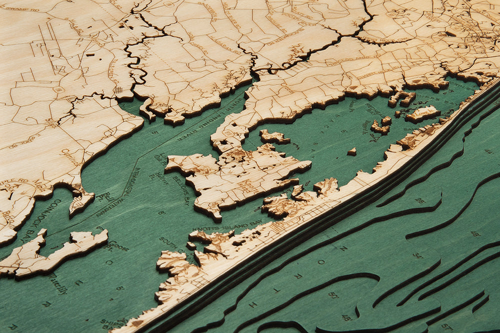 Each 3D nautical wood map is made with incredible attention to detail. Layers of natural Birch wood are laser-cut and glued together to illustrate the incredible depth that makes our 3D wood maps unique. An artist hand-stains the surrounding water, and landmarks are etched into the final wood chart. A custom wood frame and ultra-transparent acrylic put the finishing touches on this 3D map of Virginia Beach