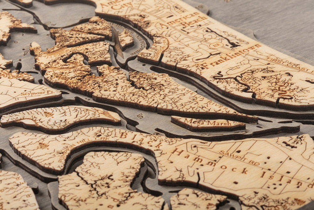 The Amelia Island, Florida, 3D wood map highlights the roadways and points of interest in high-quality birch. Laser-cut to precisely detail the waterways and surrounding land, each piece is glued together seamlessly to create the topography and bathymetry of Amelia Island. The wood is hand-stained to create visual depth, and the points of interest are etched into the wood. Your nautical map is finished in a solid wood frame and protected by acrylic glass.