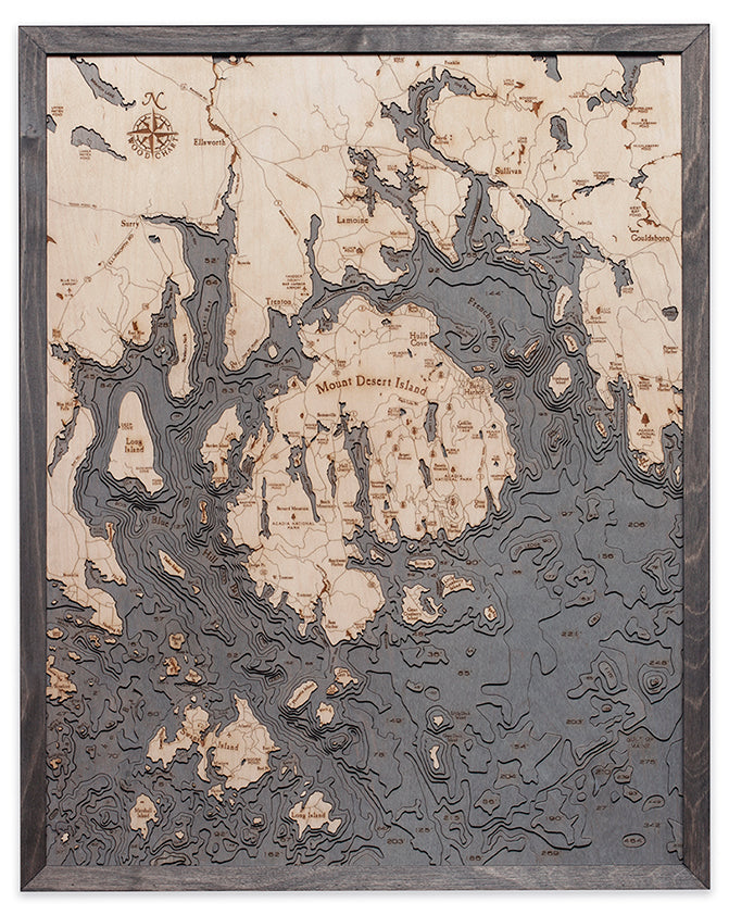 The historic town, known as the gateway to Acadia National Park, plays host to more than two and a half million visitors every year, with most coming to enjoy hiking, bicycling, and horseback riding through the community’s automobile-free roads. The area has been a longtime favorite for celebrities and business moguls, but visitors from across the world come to the island to enjoy the scenery, shopping, and wildlife. Our 3D nautical wood map captures the incredible topography of northern Maine, including points of interest such as Acadia National Park, Trenton, Blue Hill Bay, and Bar Harbor.