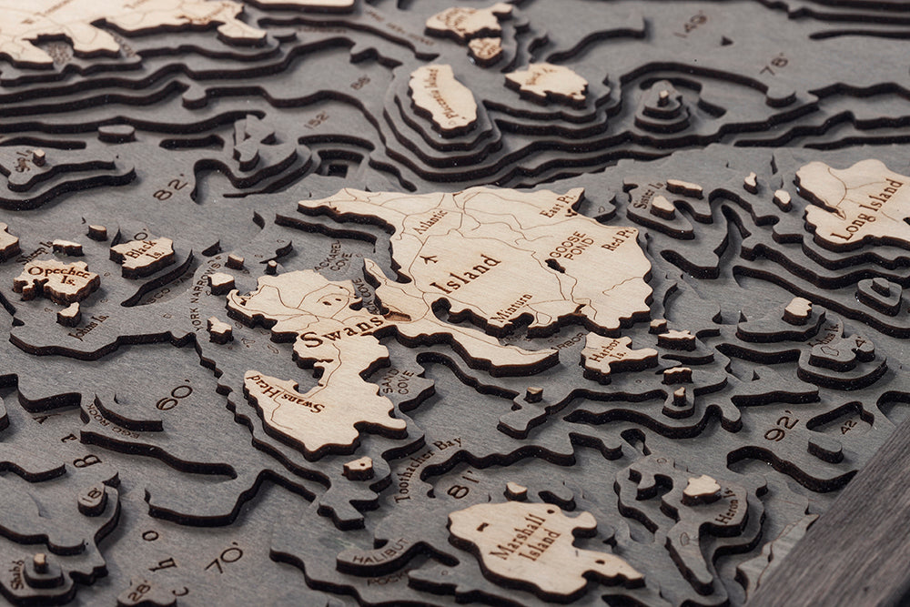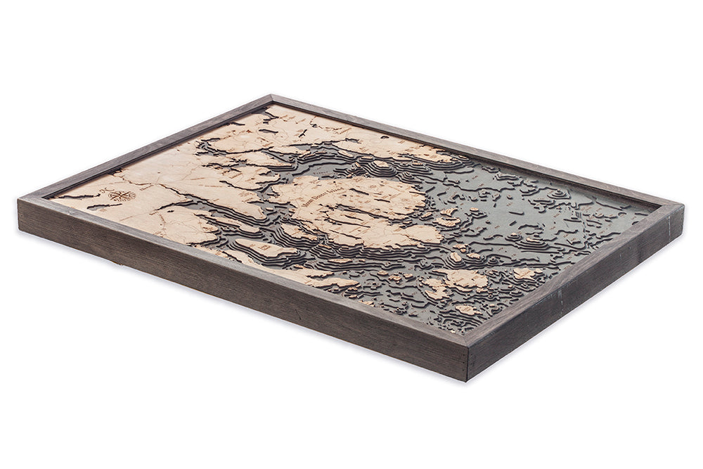 Each of our nautical wood maps begin with a bathymetric map to measure the depth of water around the island’s shorelines. Once the Birch layers are complete, the water is hand-stained blue green and the landmarks and other important points of interest are engraved into the lake art’s surface. The lake art is finished with a custom wood frame and durable, ultra-transparent acrylic to safeguard it for years to come.