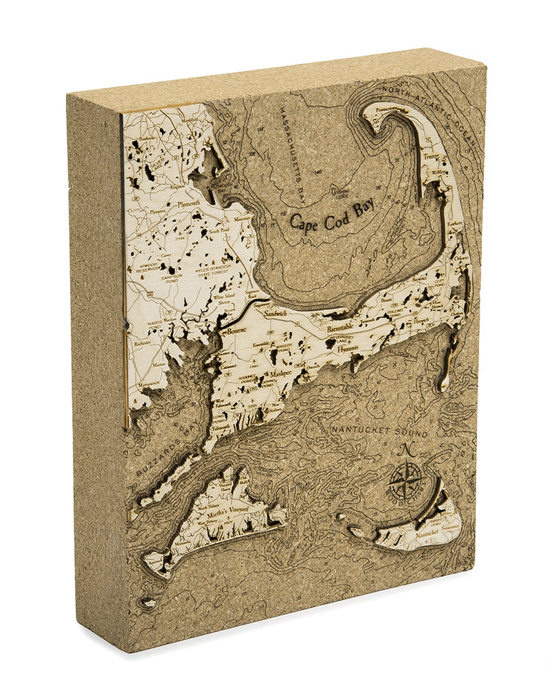 Our 3D Cape Cod cork map showcases the natural beauty of the island shorelines. The map is made with laser-cut natural Baltic birch while the depths of the water are carved into the surface of the cork, creating a beautiful view of the map’s topographical detail. The Cape Cod wood map is finished with engraved landmarks and other points of interest.