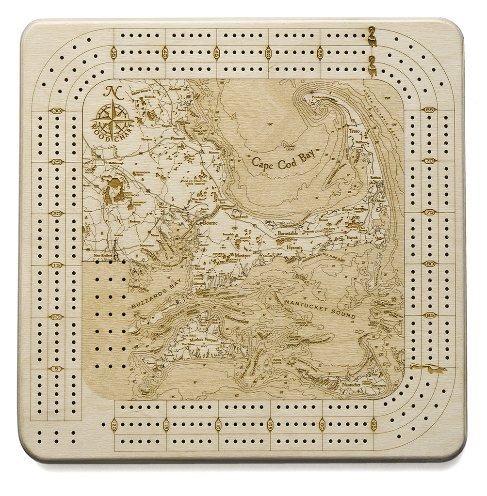 Our Cape Cod Cribbage Board adds a nautical aspect to a beloved card game. A laser-etched wood map decorates the front of the cribbage board that comes with skunks, pegs, and a hidden storage compartment in the back. Each wood cribbage board is laser engraved with the Cape Cod shoreline, etched with points of interest, and then rubbed with an oil-based finish to preserve the one-of-a-kind grain of the natural wood. Store this topographic cribbage board on your table or hang it on the wall with the nail slot in the back of the board.