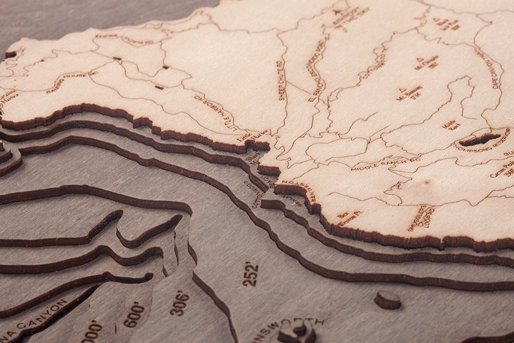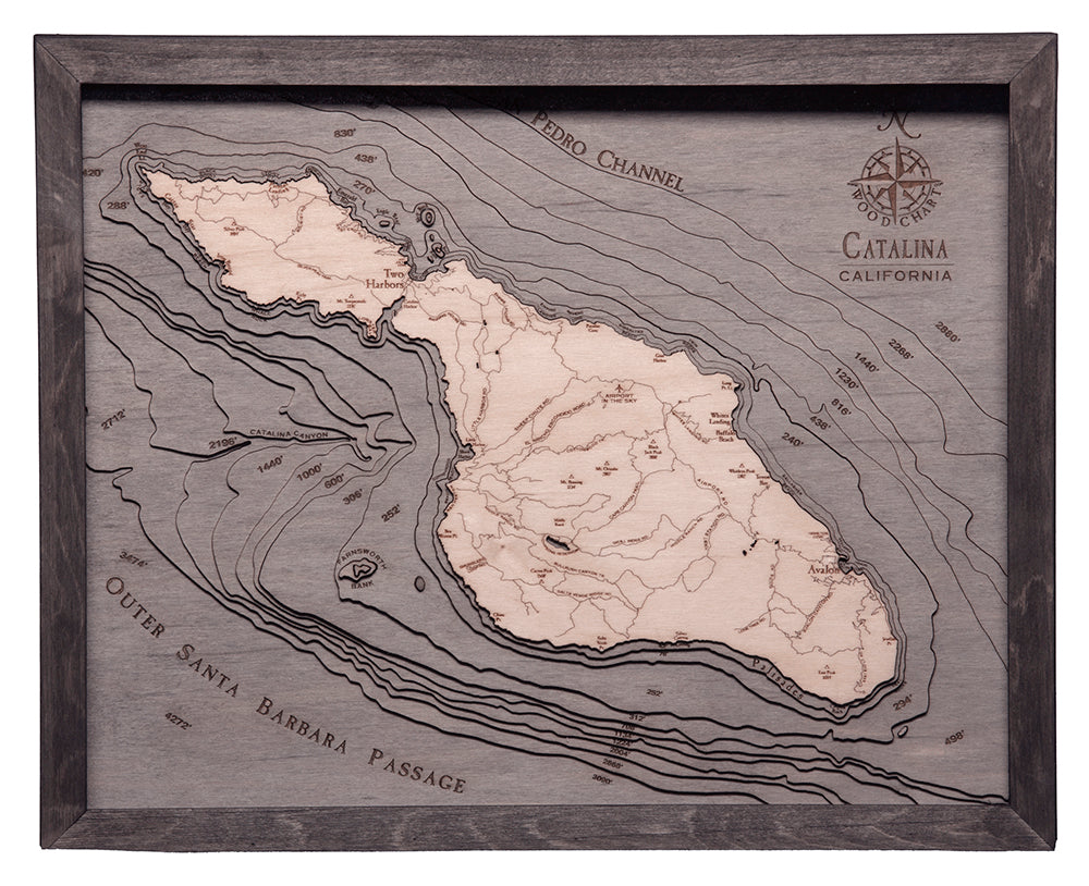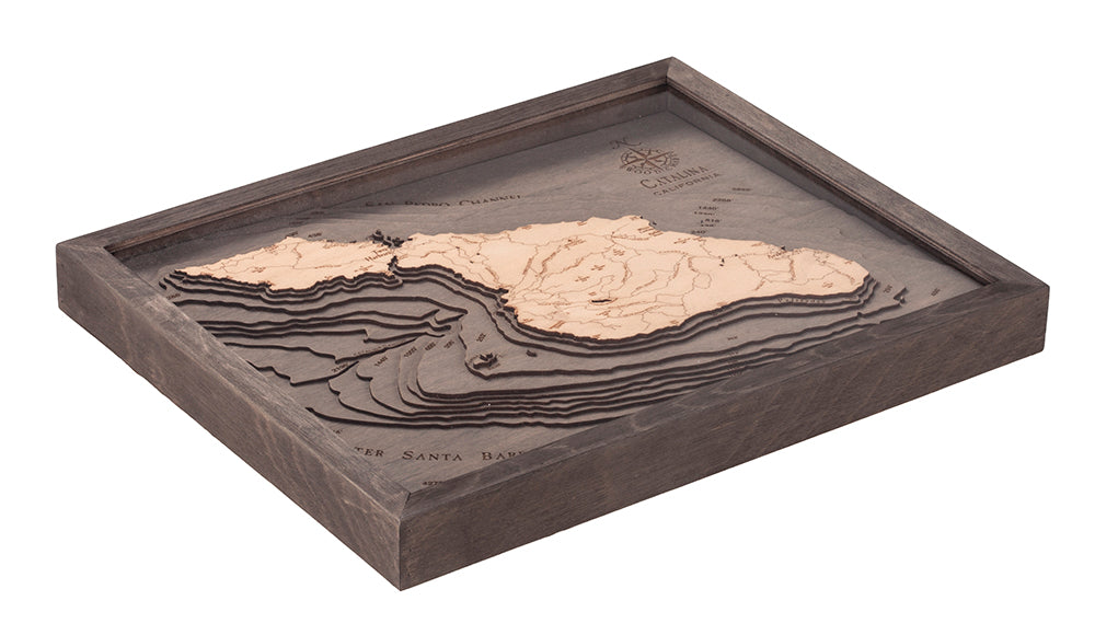 Our 3D nautical wood map of Catalina showcases the incredible topography of the island. Birch is laser cut and glued together to create the stunning depth our maps are known for. The nautical map features hand-stained water and laser-etched points of interest. A custom wood frame and acrylic cover provide protection and vibrancy for years to come.