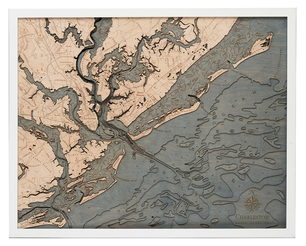 Our 3D nautical wood map of Charleston, South Carolina, is made using laser-cut layers of natural Birch. The pieces are glued together to create the visual depth of the beautiful coastline and barrier islands with 2mm precision, and the water is hand-stained to add an extra pop of color. Points of interest and landmarks are etched into the map’s surface before an artist pairs the map with a custom wood frame and acrylic cover for durability and protection.