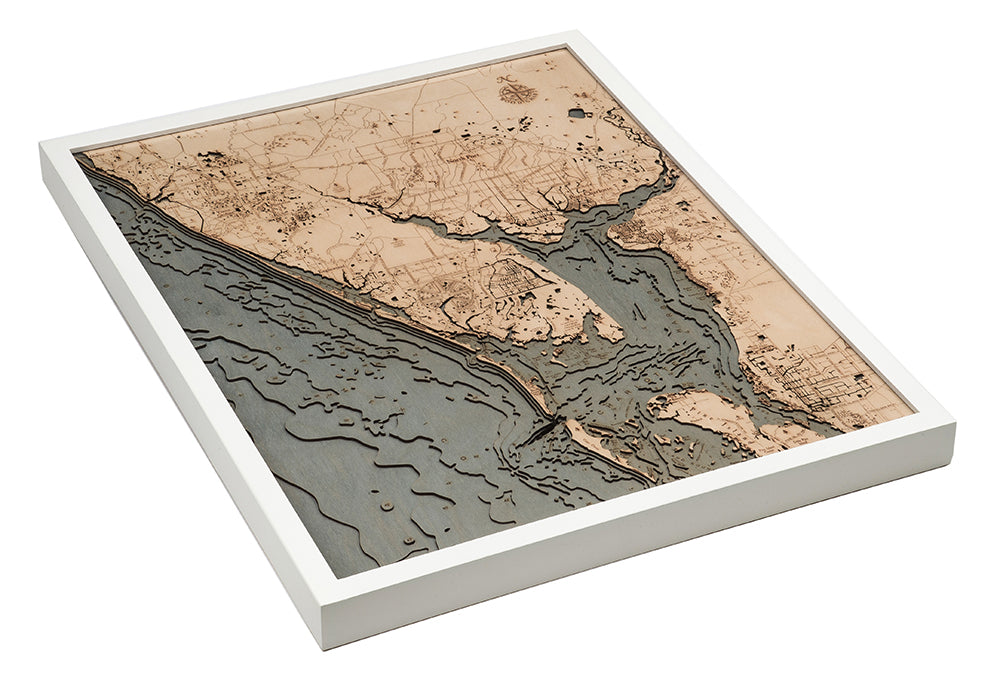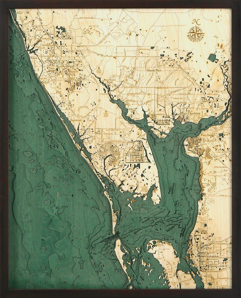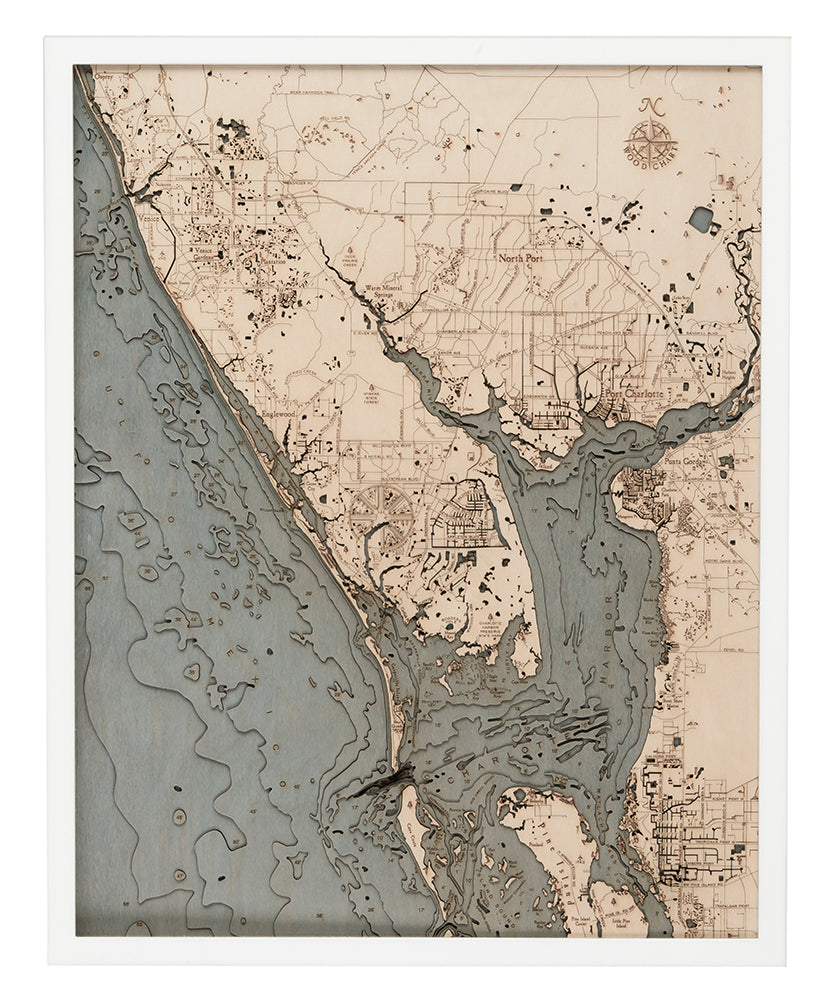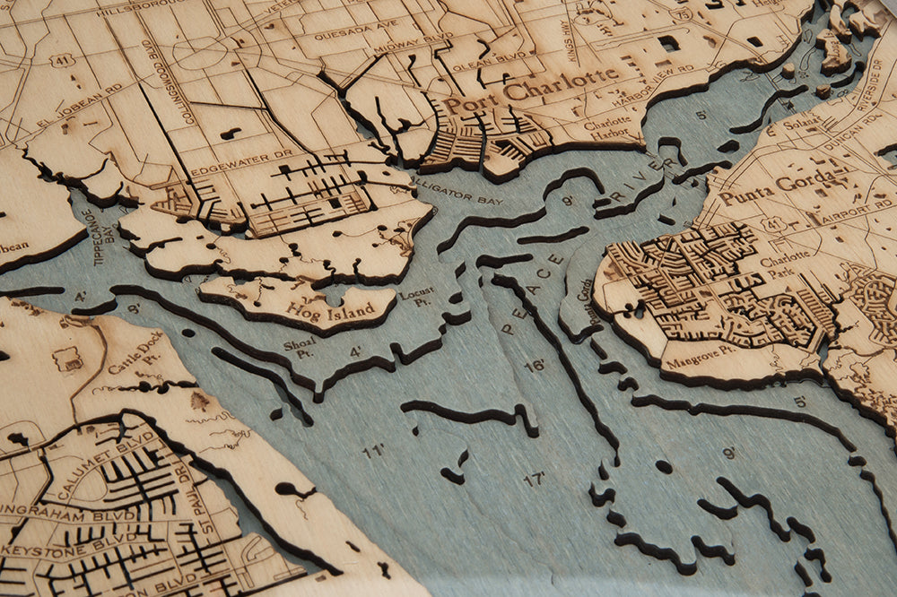 Our 3D nautical wood map of Charlotte Harbor begins with layers of Birch that are laser cut and glued together to form the intricate shoreline the area is known for and add a vibrant dimension to the framed piece. The water is hand-stained, and points of interest, roads, and ocean depths are etched into the map’s surface. The 3D nautical wood map is finished with a custom wood frame and a durable acrylic cover for protection.