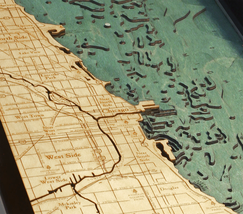 Our 3D wood map of Chicago is skillfully laser-cut from pieces of Birch which are then glued together in the shape of the city’s coastline. A bathymetric chart identifies the depths of the Chicago Harbor, and the wood is then cut to form the vibrant beauty and depth of the landscape. Once the 3D wood map’s core is complete, an artist hand-stains the water and includes etched points of interest and other landmarks on the map’s surface. A solid wood frame and acrylic protective shield provide the finishing touches.