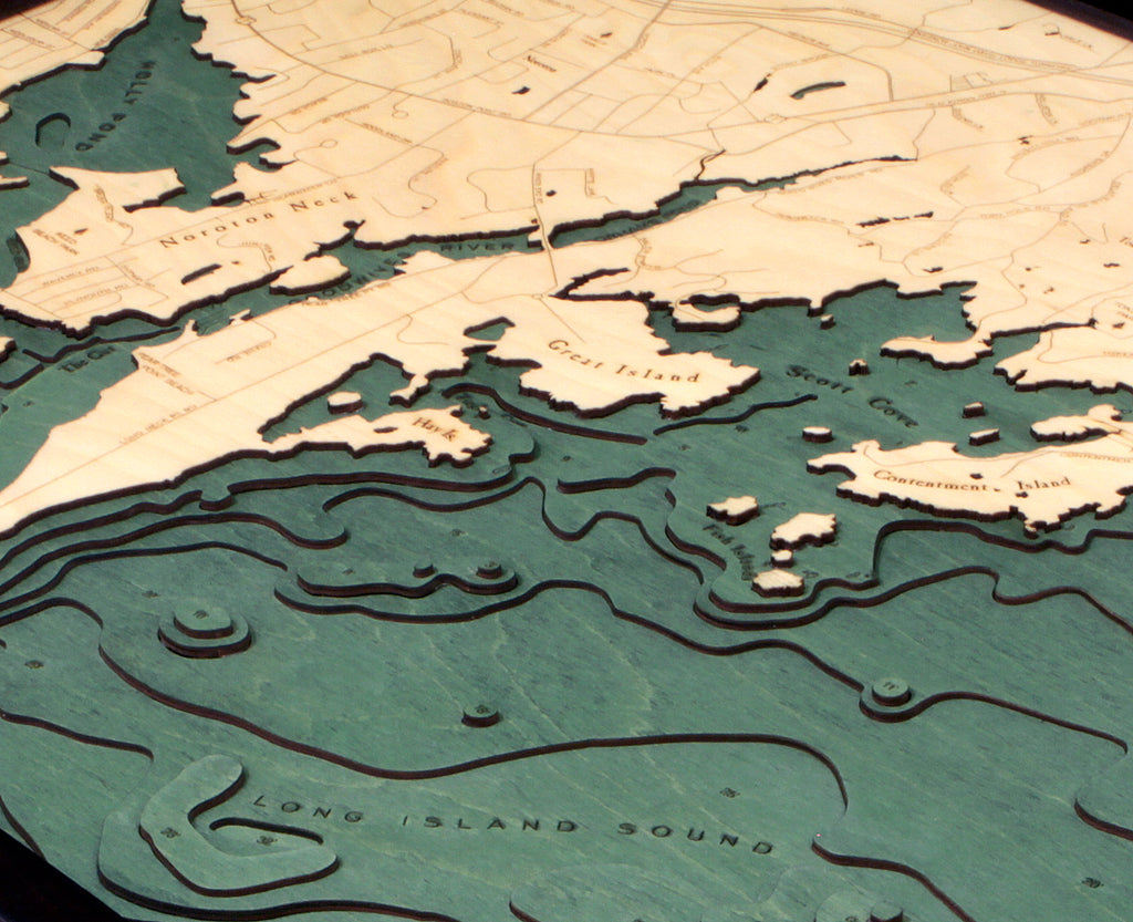 With eleven parks, several beaches, country clubs, and a yacht club, Darien packs a punch into its thirteen-square-mile area. The community is one of the wealthiest towns in the country and has the youngest population of any non-college town in Connecticut. Our 3D nautical wood maps capture the beauty of Darien and its surrounding coastline with precision and depth you won’t find anywhere else.