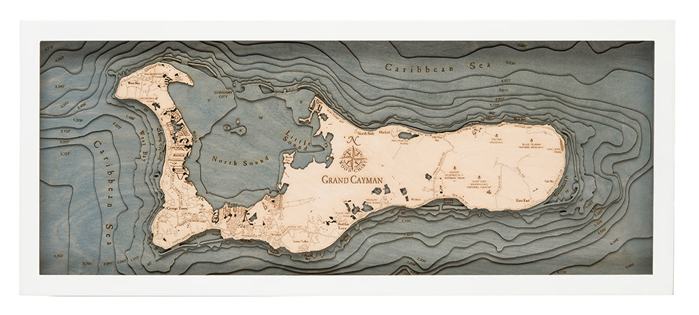 Our 3D wood map of Grand Cayman showcases the unique ocean floor surrounding the island and its beautiful shoreline. The layers of birch are cut and glued together to form the unique topography of the area that makes the map appear to jump out of its frame. The surrounding water of the nautical wood map is hand-stained a beautiful blue-green, and points of interest, including Blue Iguana Nature Reserve and Stingray City, are expertly etched into the wood chart’s surface.