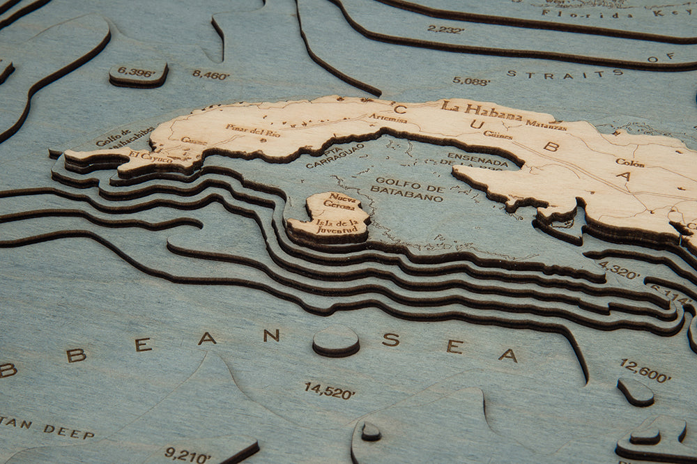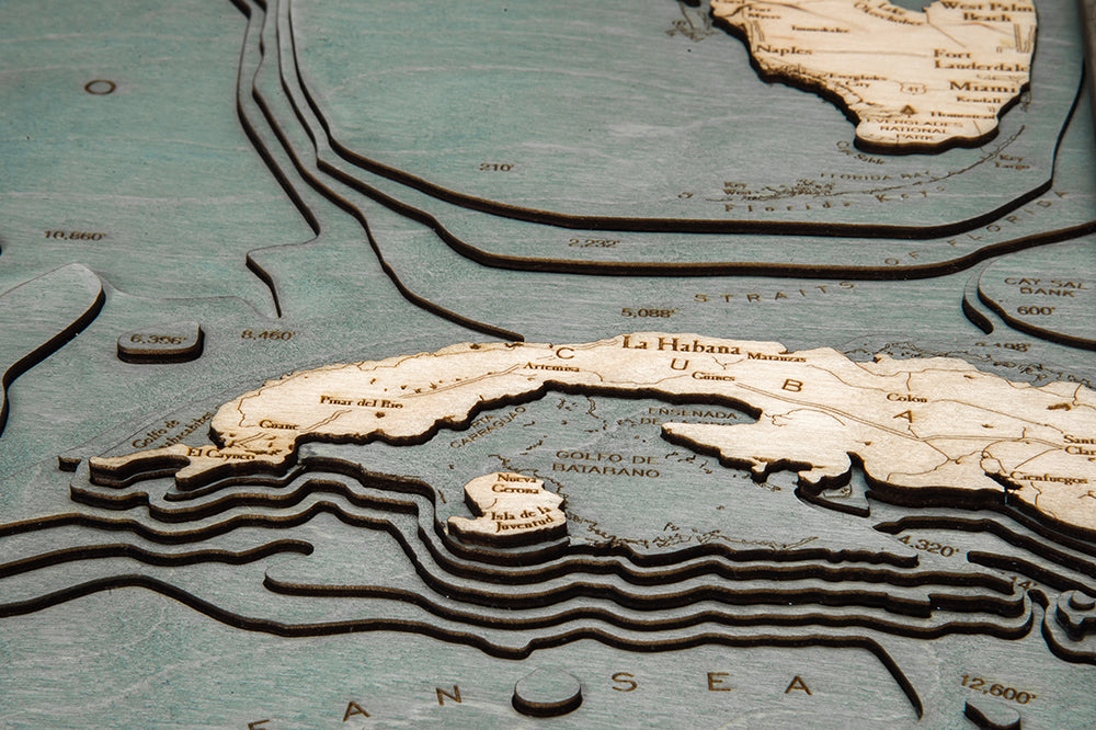 Our 3D wood map of the Gulf of Mexico begins with precise depth measurements from a bathymetric chart. An artist laser cuts high-quality birch pieces into the gulf's exact shorelines, layering them together to create the depth, dimension, and beauty that make our wood charts famous. The water is hand-stained, and points of interest, roads, and water depths are engraved into the nautical map’s surface. It is finished with a custom-sized wood frame and a durable piece of acrylic glass for protection.