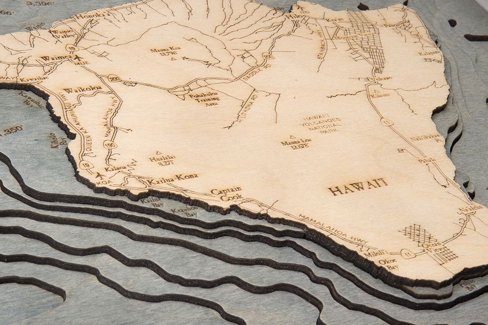 This nautical wood map of Hawai’i showcases the natural beauty the island region has to offer. Each map features the highest quality high-quality birch, which is expertly laser cut into layers and glued together to create the dimension seen on each of our wood charts. Next, an artist etches significant points of interest and hand-stains the portion of the map depicting the surrounding water. A solid wood frame in one of two beautiful colors completes the piece, creating wall art that will last for years to come.