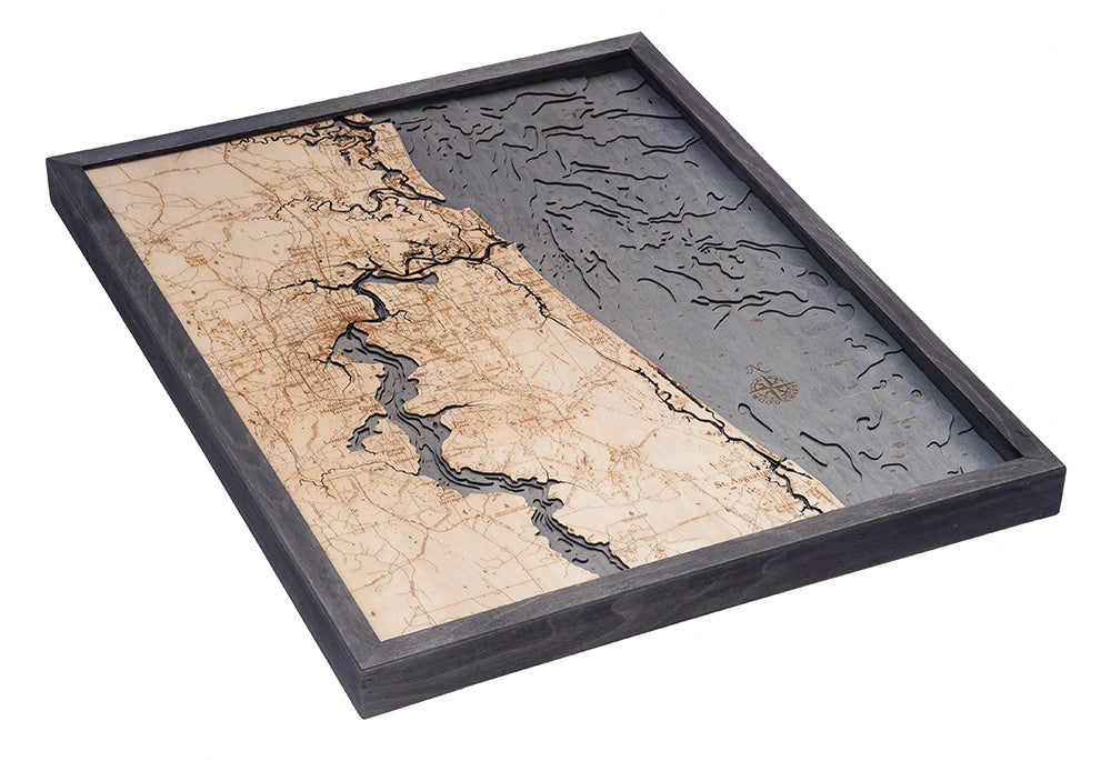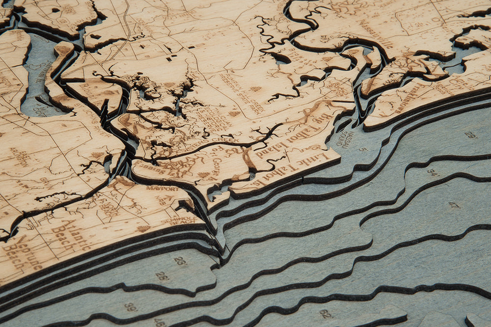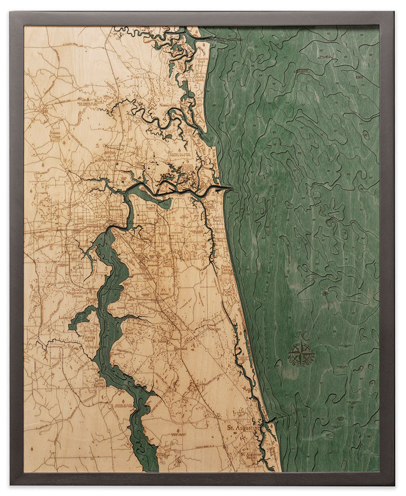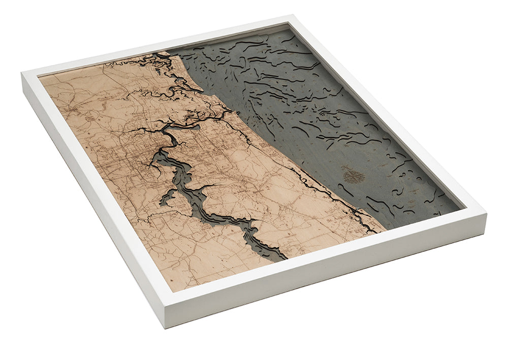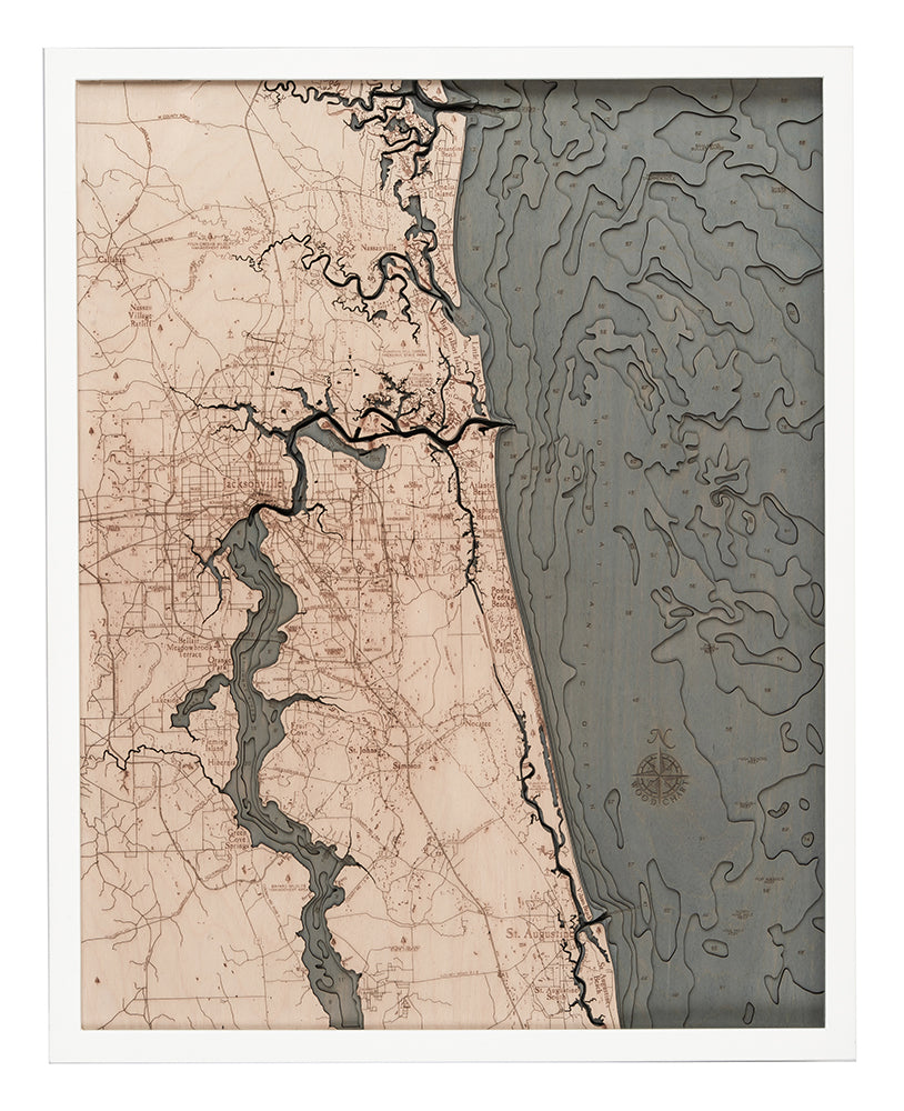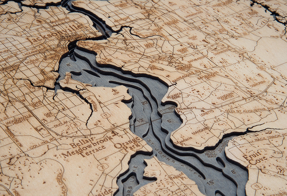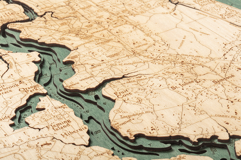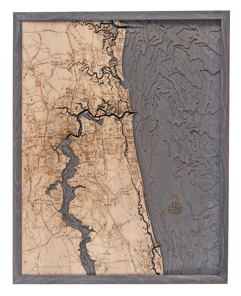 The Jacksonville, Florida, 3D wood map is created from high-quality birch. Laser-cut to precisely replicate the shoreline and waterways, each piece is glued together seamlessly to create the topography and bathymetry of the Jacksonville area. The wood is hand-stained to create visual depth and the points of interest are etched into the wood. Your nautical map is finished in a solid wood frame and protected by acrylic glass.