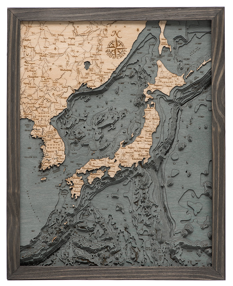 Japan and Korea 3-D Nautical Wood Chart, Small, 16" x 20"