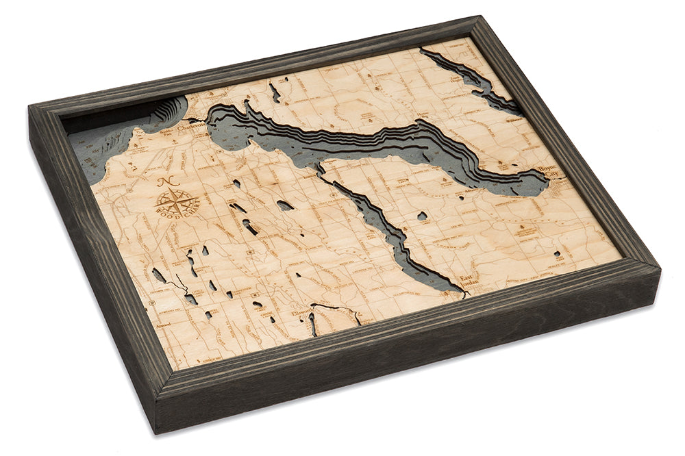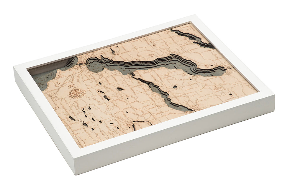Our Lake Charlevoix lake art begins with a bathymetric chart detailing the shoreline and water’s depths. Next, a designer laser cuts pieces of high-quality birch, gluing them together to form the stunning dimension our maps are known for. The lake art’s water is then hand-stained, and points of interest are precisely etched into the map’s surface. Finally, each lake art map is finished with a custom solid wood frame and acrylic layer for vibrance and protection.