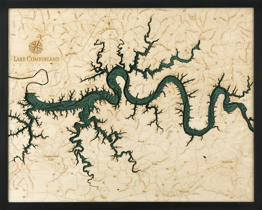 Our topographical map of Lake Cumberland begins with a bathymetric map to determine the lake’s shorelines and water depths. An artist then laser cuts pieces of high-quality birch and glues them together to create the dimensions seen in our lake art. Next, points of interest are engraved into the map, and the water is hand-stained for added vibrancy. Finally, a custom solid wood frame provides the finishing touch to your lake art.