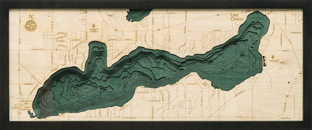 Lake Geneva, Wisconsin 3-D Nautical Wood Chart, Medium, 13.5" x 31"