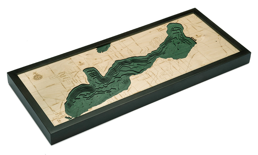 Our topographical map of Lake Geneva features layers of laser-cut high-quality birch glued together to form the lake’s precise shoreline and water depths. An artist hand-stains the areas representing water and engraves landmarks and points of interest into the map’s surface. A solid custom wood frame and acrylic cover finish the lake art.