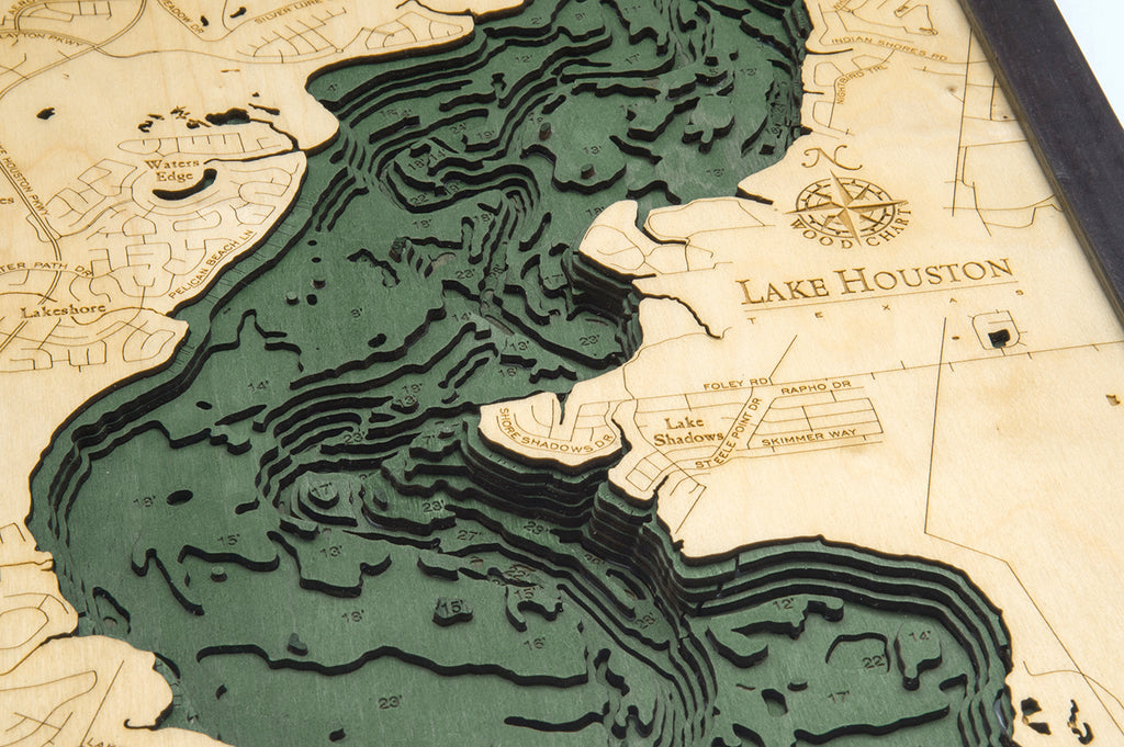 Although the shorelines of Lake Houston offer picture-perfect landscapes for relaxation and adventure, the true beauty of this Texas reservoir sits beneath the lake’s surface. Whether you’ve been traveling to the lake for decades or visited for a once-in-a-lifetime vacation, our topographical wood chart of Lake Houston will bring back all your favorite memories of this beautiful oasis.