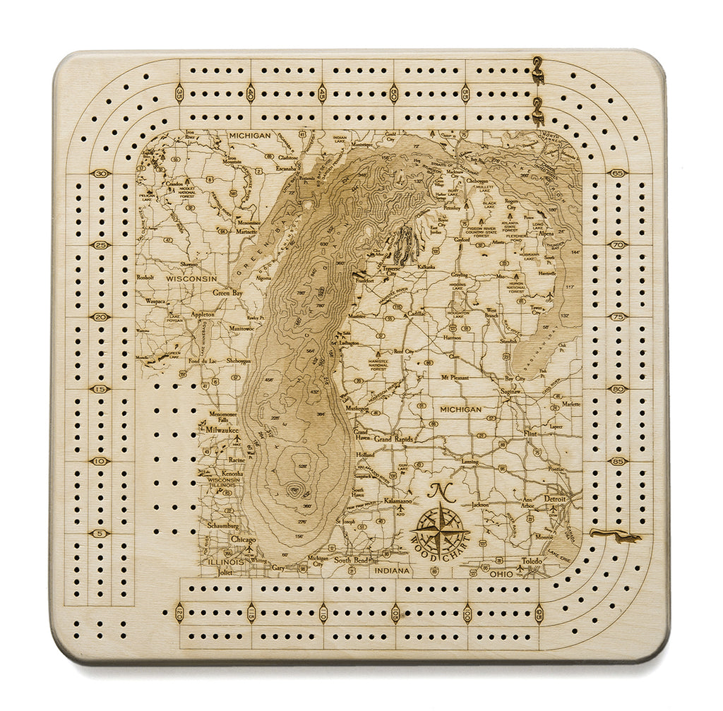 Our Lake Michigan Cribbage Board allows scorekeeping for three players and uniquely showcases the topographical beauty of the region. Each board features a wood lake etching of the lake’s shoreline and depth measurements, including points of interest and landmarks the area is known for. Our lake art cribbage boards include skunks, pegs, and a hidden compartment and are sealed with an oil-based finish that highlights the natural grain of the high-quality Birch. Place this board on your coffee table or hang it on the wall using the notch on the back.