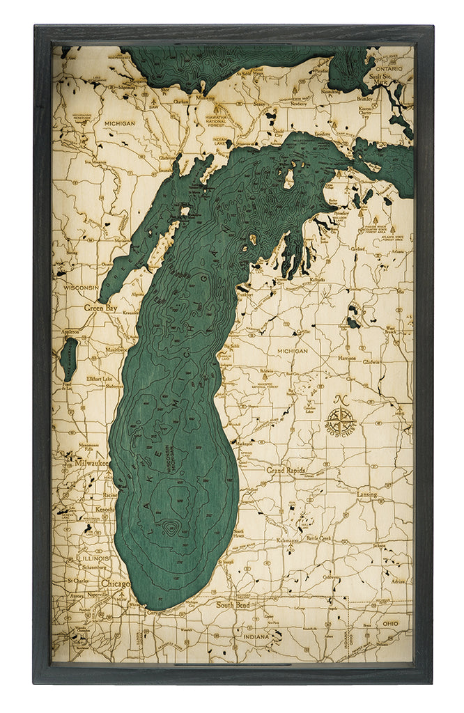 Our Lake Michigan serving tray offers a beautiful mix of beauty and functional lake art. An artist creates the piece using a hand-stained piece of high-quality birch that features etchings of precise water depths and landmarks. The second piece of birch with additional engravings is placed on top in the precise outline of the Lake Michigan shoreline, adding depth and dimension. This topographical wood lake is topped with a piece of acrylic glass and surrounded by a custom wood frame for a one-of-a-kind look.