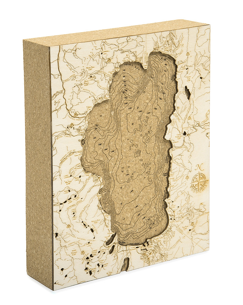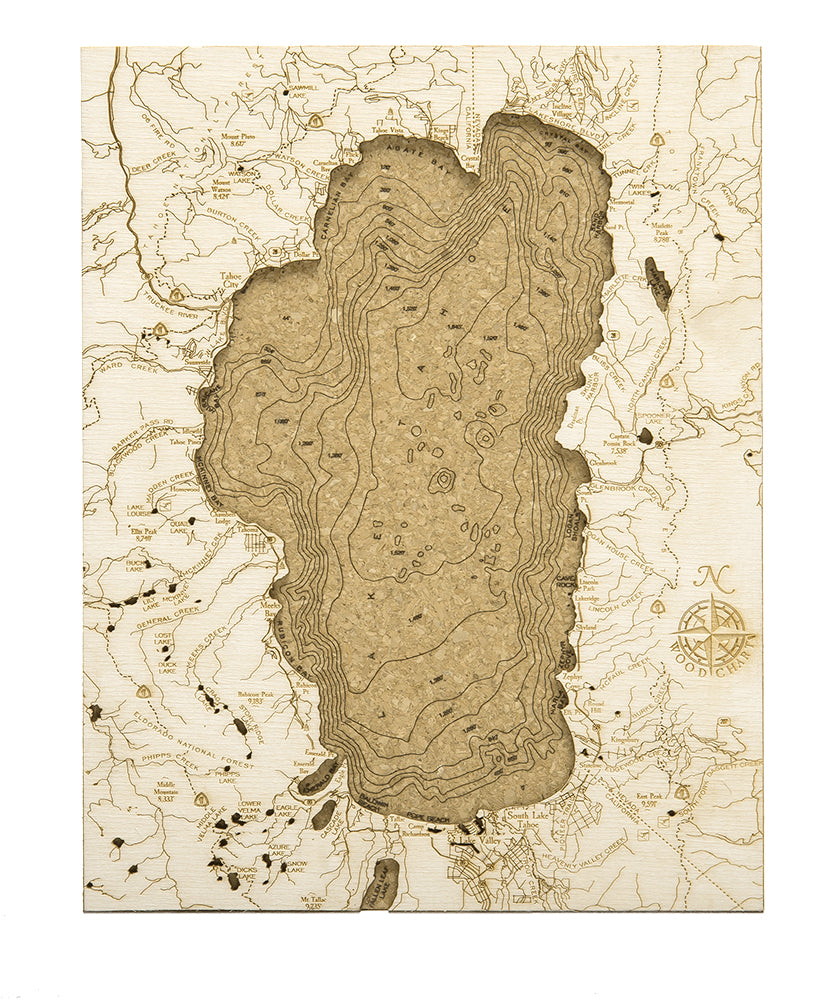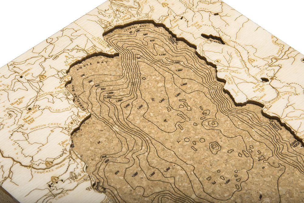 Our Lake Tahoe Cork Map features two-millimeter laser cutting to add incredible precision to the finished lake art. An artist makes the map's surface with high-quality birch, cutting the wood lake’s outline to portray the exact shoreline, coves, and outcroppings. The wood is engraved with points of interest, major roadways, and landmarks before being hand-placed on a piece of cork engraved with topographic depth measurements.