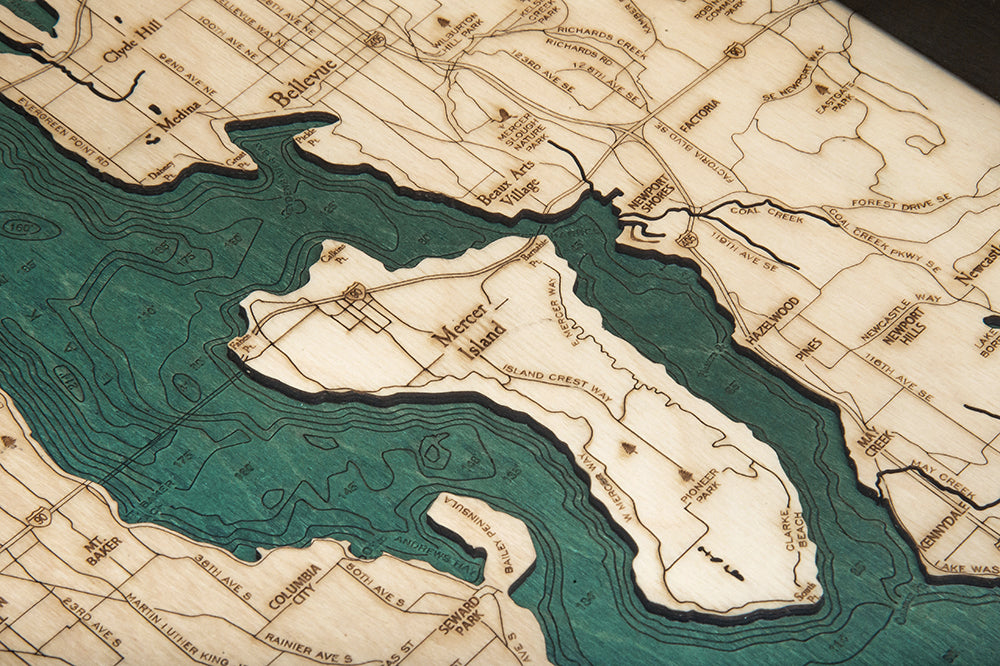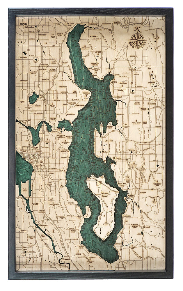Our Lake Washington Serving Tray showcases the beauty of this breathtaking lake by combining handmade elements with a precise design you won’t find anywhere else. Each tray begins with a hand-stained piece of high-quality birch cut to fit the perfect view of the lake. Depth markers are etched into the surface, adding a look of dimension to the wood lake tray. The second layer sits slightly above the first and features a laser-cut shoreline of Lake Washington with landmarks and points of interest etched into its surface. An acrylic glass top protects this topographical lake art.