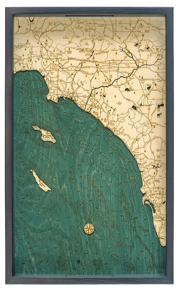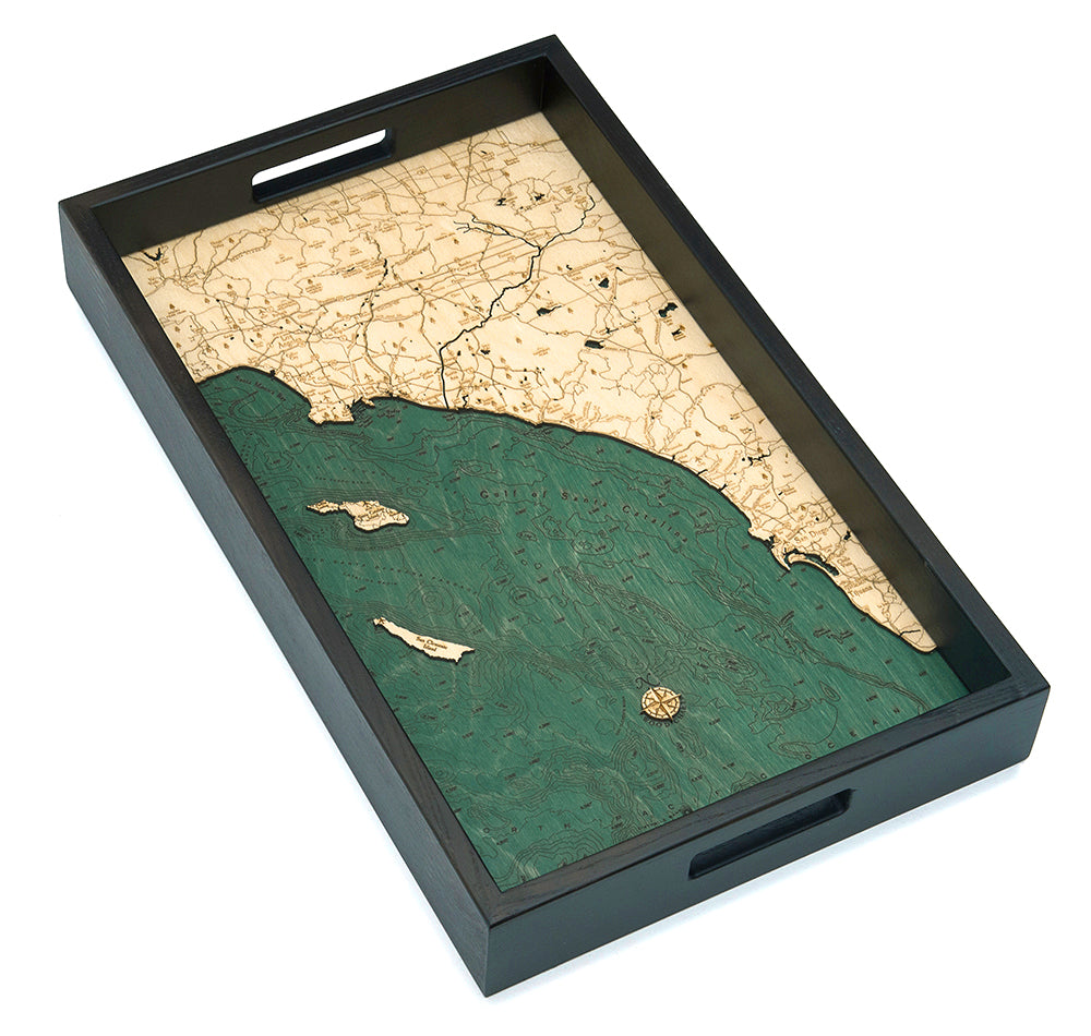 Our Los Angeles to San Diego Serving Tray provides a piece of home décor that is both fun and functional. Each tray begins with a hand-stained piece of high-quality birch, engraved with the precise ocean topography and water depths of the region. An artist laser-cuts the second piece of birch into the exact shape of the shoreline, expertly placing it on top of the tray’s surface to create a dimensional look that stands out. The tray is fitted with a custom-sized wood frame and acrylic glass layer for protection and durability.