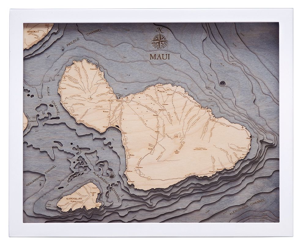 Our nautical wood map of Maui, Hawaii, showcases the incredible topography of the island’s landscape in a way that you won’t find anywhere else. An artist uses a bathymetric chart to laser cut pieces of high-quality birch into the exact shape of the underwater landscape of Maui, expertly piecing them together to create the visual depth and dimension the wood chart is known for. The water is hand-stained, and points of interest are etched into the surface of the 3D wood map. The map is complete with a custom-sized solid wood frame and protective acrylic layer.