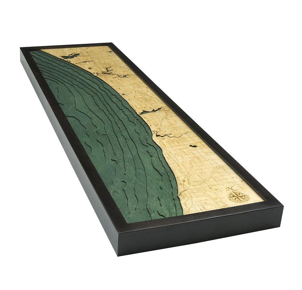 Our topographical map of Lake Michigan’s eastern shore displays the untouched beauty the Midwest state has to offer. This lake art begins with a bathymetric chart, which an artist then uses to laser cut pieces of high-quality birch into precise layers depicting each depth of the lake’s shoreline. The pieces are hand-stained and glued together, with the finishing piece featuring etched points of interest, landmarks, and other details you won’t find on any other wood lake map. A solid wood frame brings everything together, and a piece of acrylic glass offers maximum protection and durability.