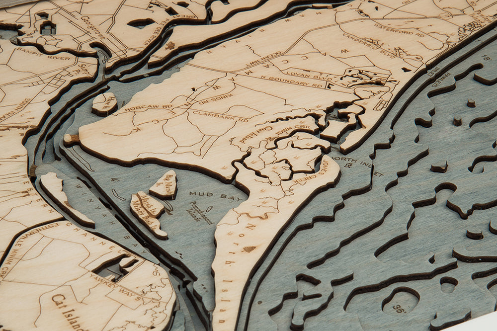 Our 3D wood map of Myrtle Beach offers a perfect way to commemorate one of your favorite vacation spots in style. The nautical map includes hand-stained high-quality birch, laser-cut layers depicting the ocean's precise water depths, etched points of interest, and other important destinations in the map’s surface that make it unlike anything else you’ll find on the market. Each map is finished with a solid wood frame and acrylic layer for protection.
