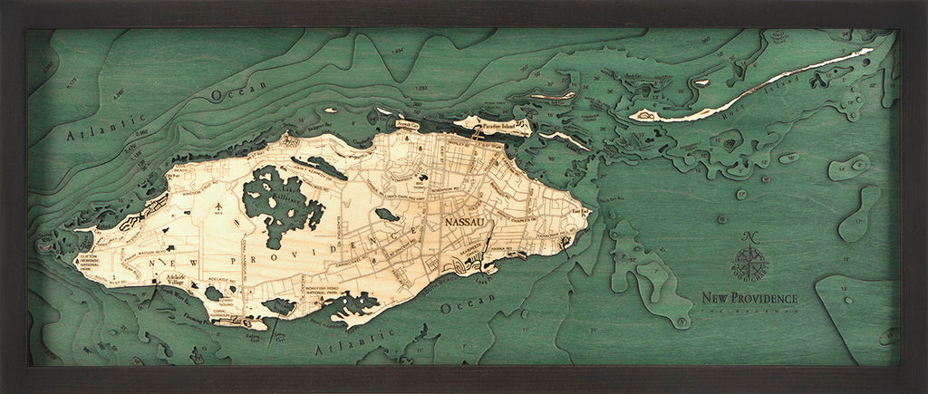 Historically known as a stronghold for pirates, Nassau is the capital of the Bahamas and located on the island of New Providence. The waters off the island boast the third-largest barrier reef in the world, Andros Barrier Reef, the details of which are clearly seen on this stunning 3D wood map.