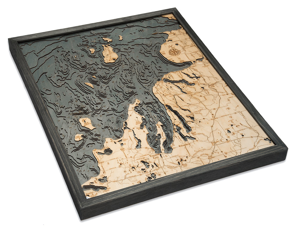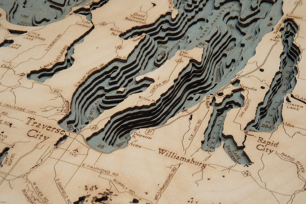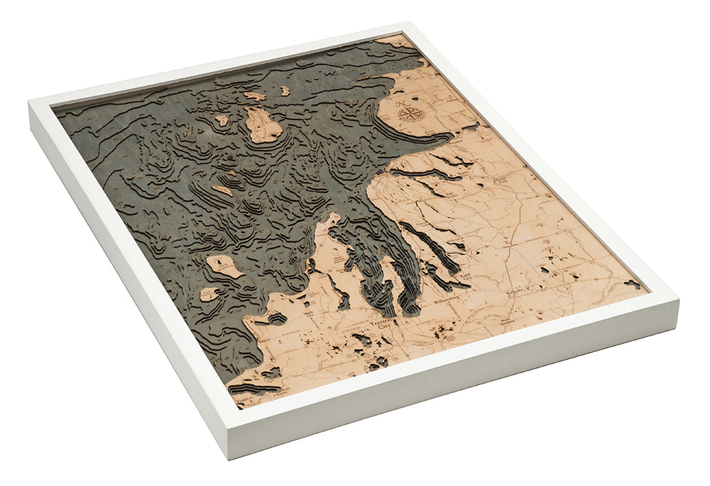 The Northwest Lower Michigan nautical wood chart is made of high-quality Birch. The wood map displays the topography of the area in intricate detail. The depths of the lakes and bays and details of the coast are expertly etched in the high-quality birch and completed with engraved points of interest. The wood map is finished in a solid wood frame and arrives ready to hang.