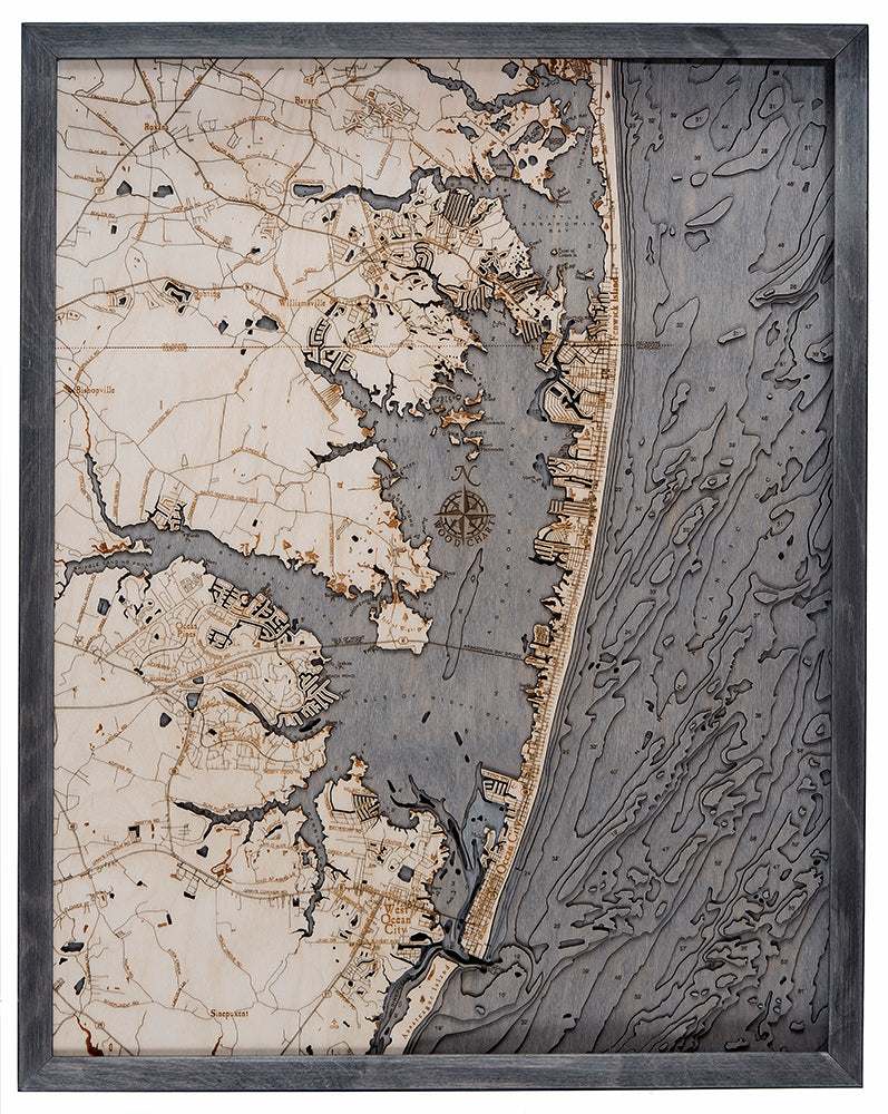 The coastline of Ocean City pulses with activity along its wooden boardwalk. This nautical wood chart features landmarks and points of interest etched into high-quality Birch. Surrounded by waterways made famous for abundant fishing, the wood map is hand-stained to reflect the majestic blue of the water.