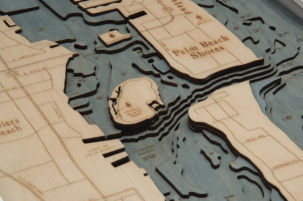 The Palm Beach, Florida 3D wood map is constructed with high-quality Birch. Each detail is laser-cut in wood and hand-glued together to create the seamless topography of the land and bathymetry of the ocean and waterways. Points of interest are clearly etched in the wood, providing a visual roadmap around the landmarks of the area. Your Palm Beach 3D wood chart arrives protested with acrylic glass and ready to hang.