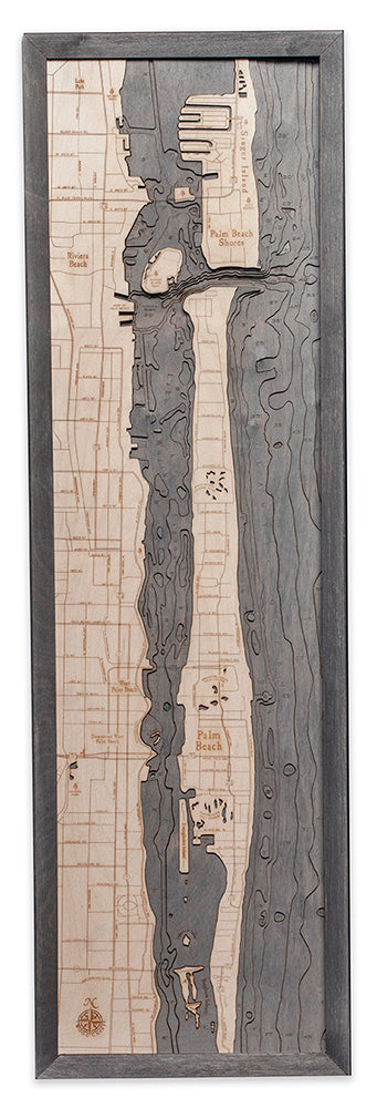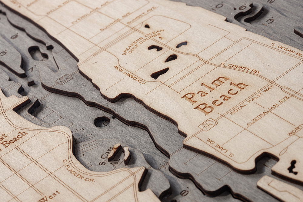 Points of Interest on the Palm Beach, Florida, 3D Nautical Wood Chart Include: