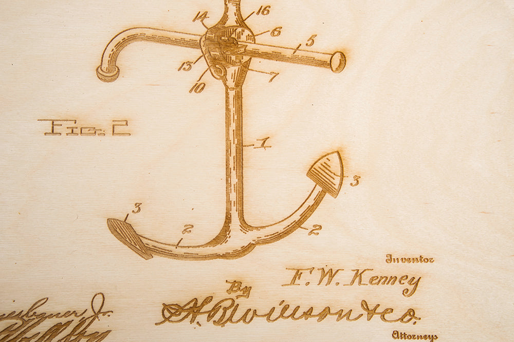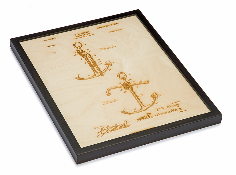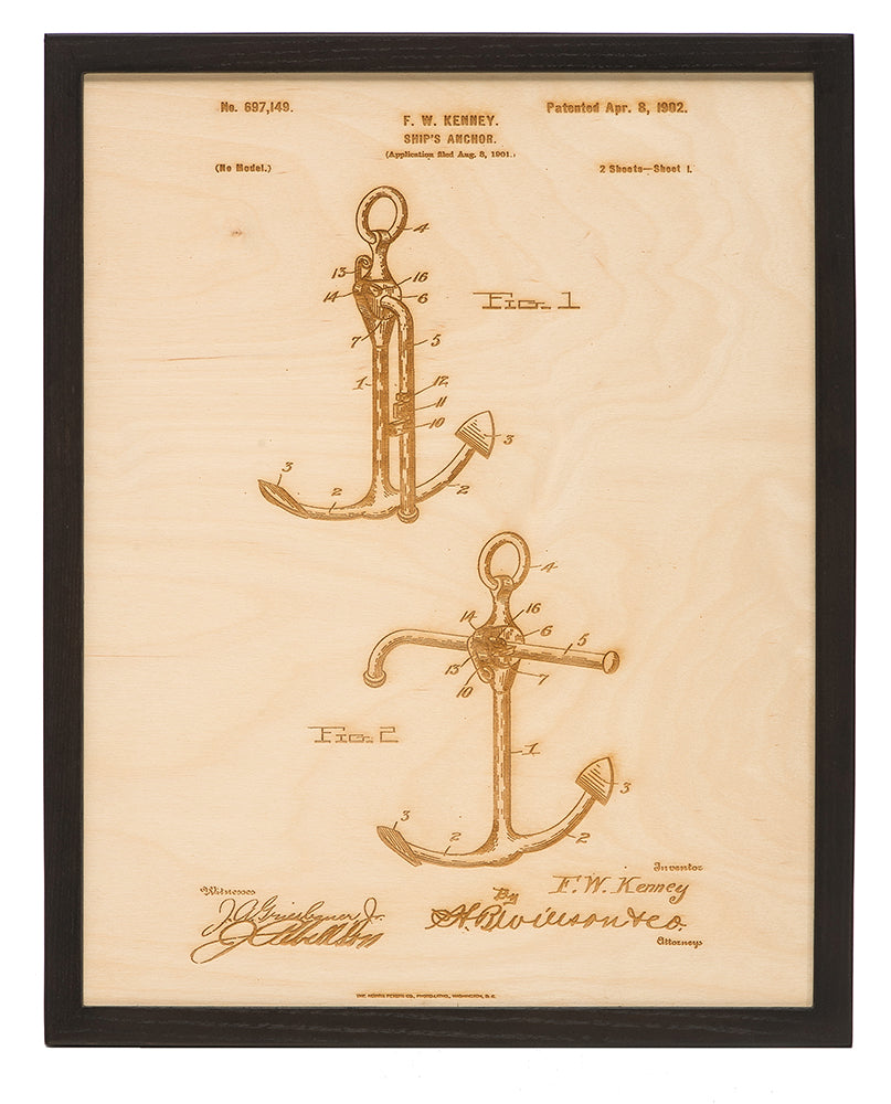 The 1902 Ship’s Anchor was invented by Frances Kenney of Providence, Rhode Island, and patented on April 8, 1902. The anchor is meticulously etched into high-quality Birch, recreating the drawings of the inventor in exquisite detail. This patent art makes the perfect addition to a home office, game room, or nautical living space.