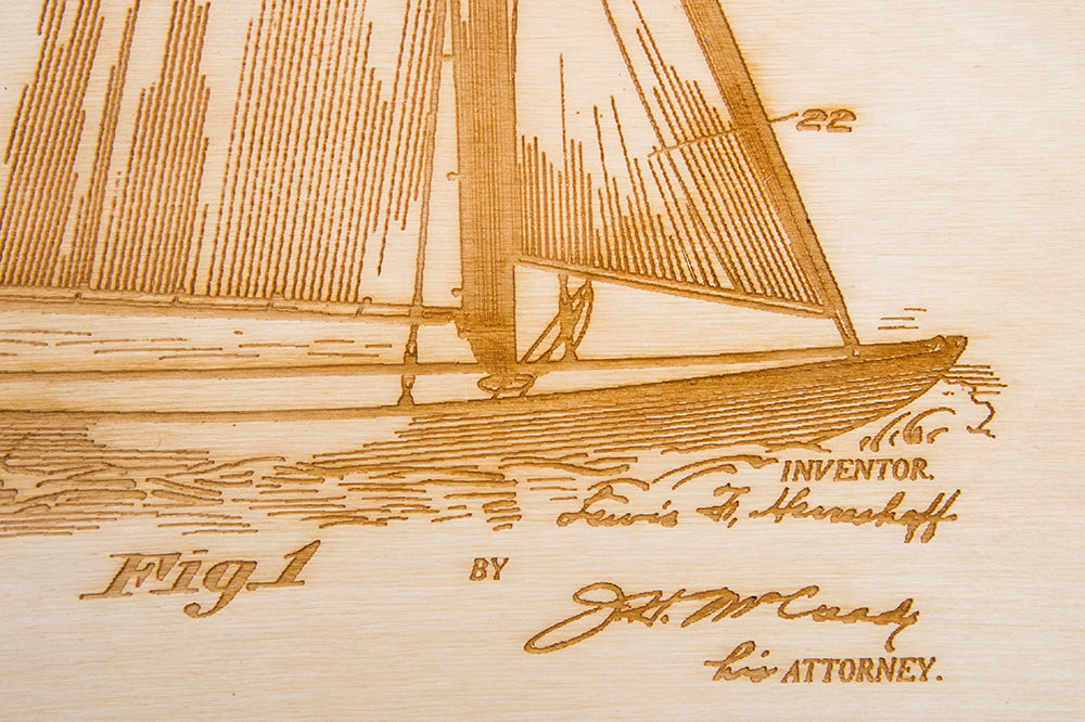 Lewis Frances Herreshoff filed his patent for his improvements to the sailboat in 1923. The improvements he sought were in the mast systems and the efficiency of the sails. His chief interest was to improve design for those crafts concerned with racing. The detail of his drawings etched in high-quality Birch are a stunning representation of his desire to improve the wind in the sails!