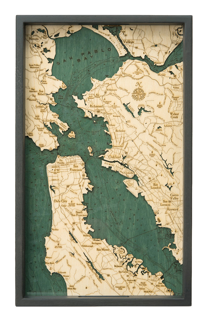 Points of Interest on a San Francisco Bay Wood Map Serving Tray:San Francisco, Oakland, Berkeley, Vallejo, San Rafael, Sausalito, Alameda, Golden Gate Park, Alcatraz, Bridge Bay, Redwood City, and Palo Alto
