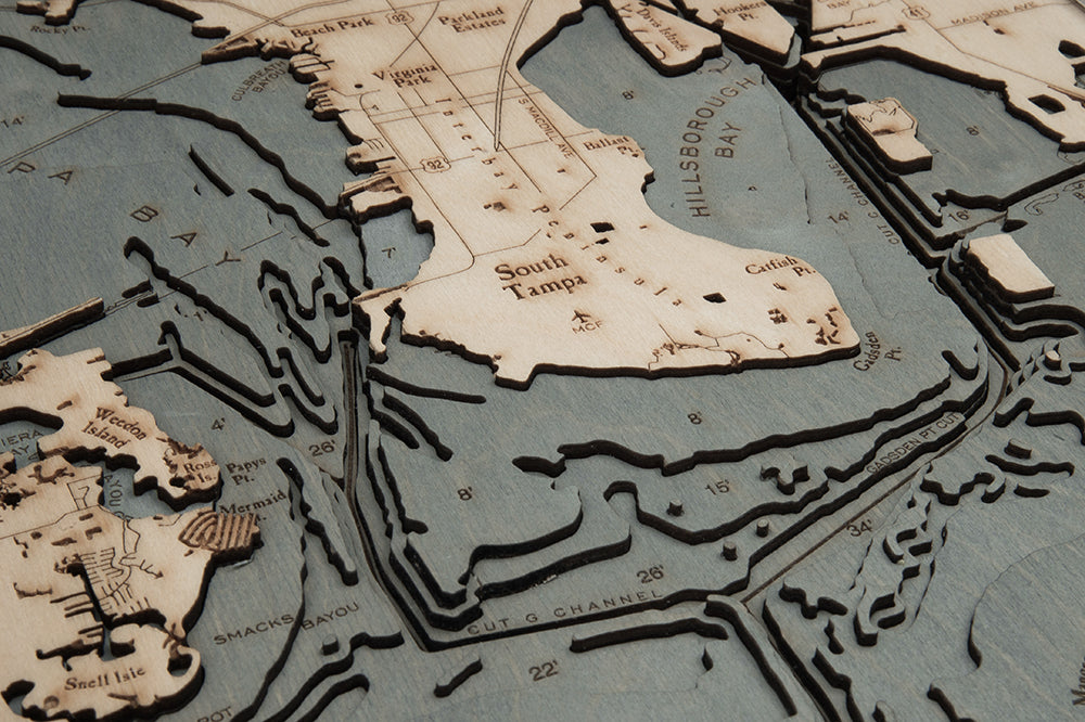 Points of Interest on the Tampa Bay, Florida, 3D Wood Map Include: