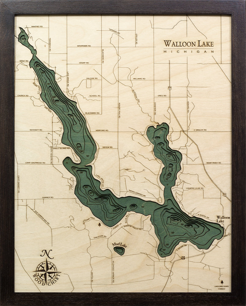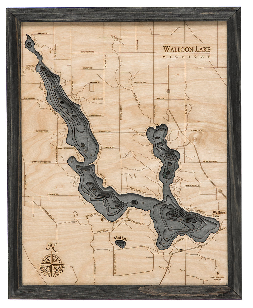 Points of Interest on the Lake Walloon, Michigan, 3D Nautical Wood Chart Include: