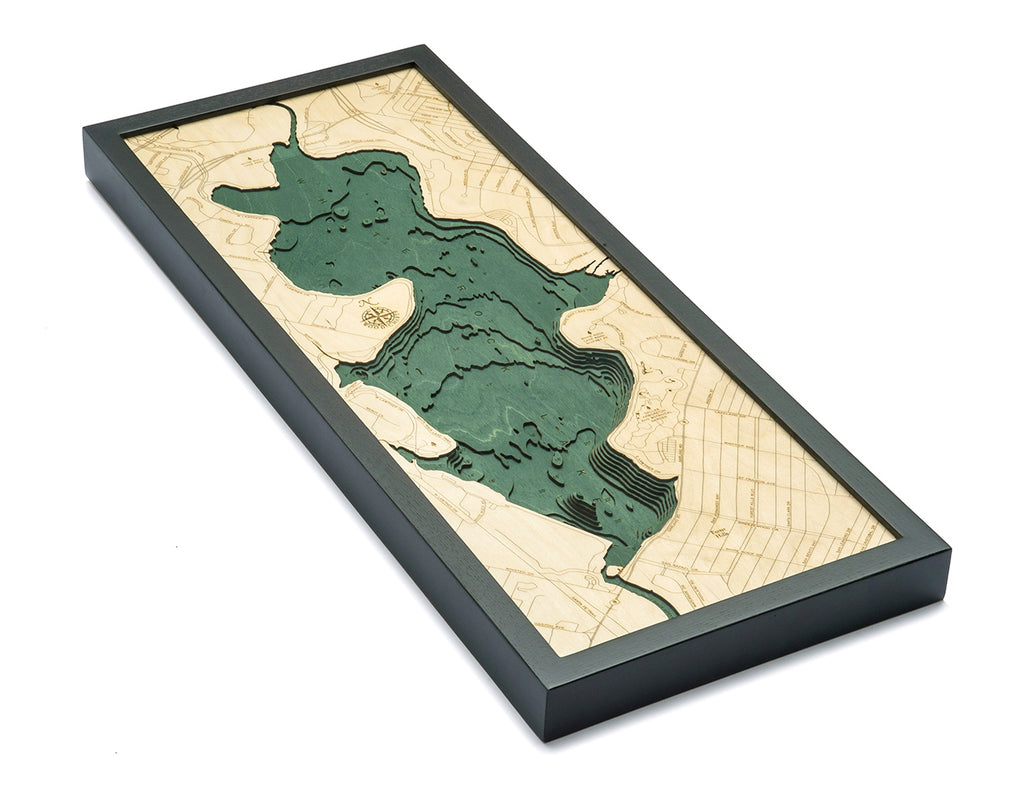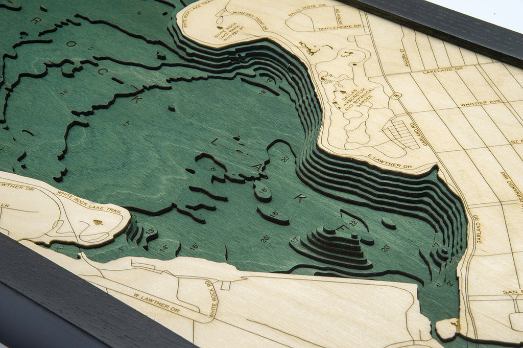 The depths of White Rock Lake are expertly and intricately detailed on the White Rock Lake, Texas, 3D wood lake. The map details are laser-cut into the high-quality Birch pieces, perfectly matching the dimensions of the shoreline. The pieces are seamlessly glued together and hand-stained to match the water and accentuate the depths and shallows. The 3D wood map is finished with laser engraved points of interest and a custom wood frame.